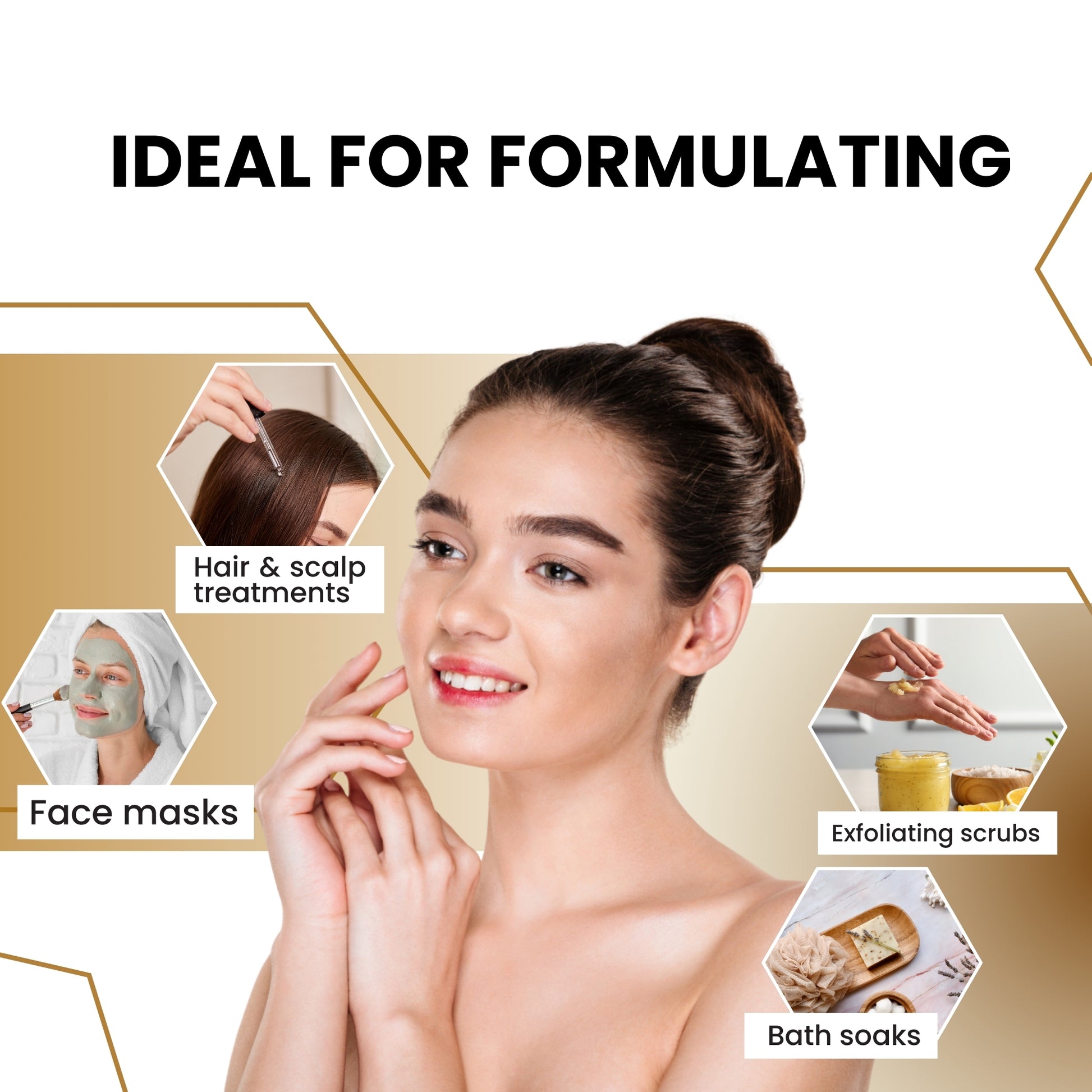 Bentonite clay is known for its ability to draw out impurities, excess oils, and toxins from the skin, making it a popular choice in face masks, body wraps, and hair treatments. When mixed with water, the clay forms a smooth paste that can be applied to the skin or scalp. It gently exfoliates the skin, unclogs pores, and can help reduce the appearance of blemishes, acne, and oiliness.