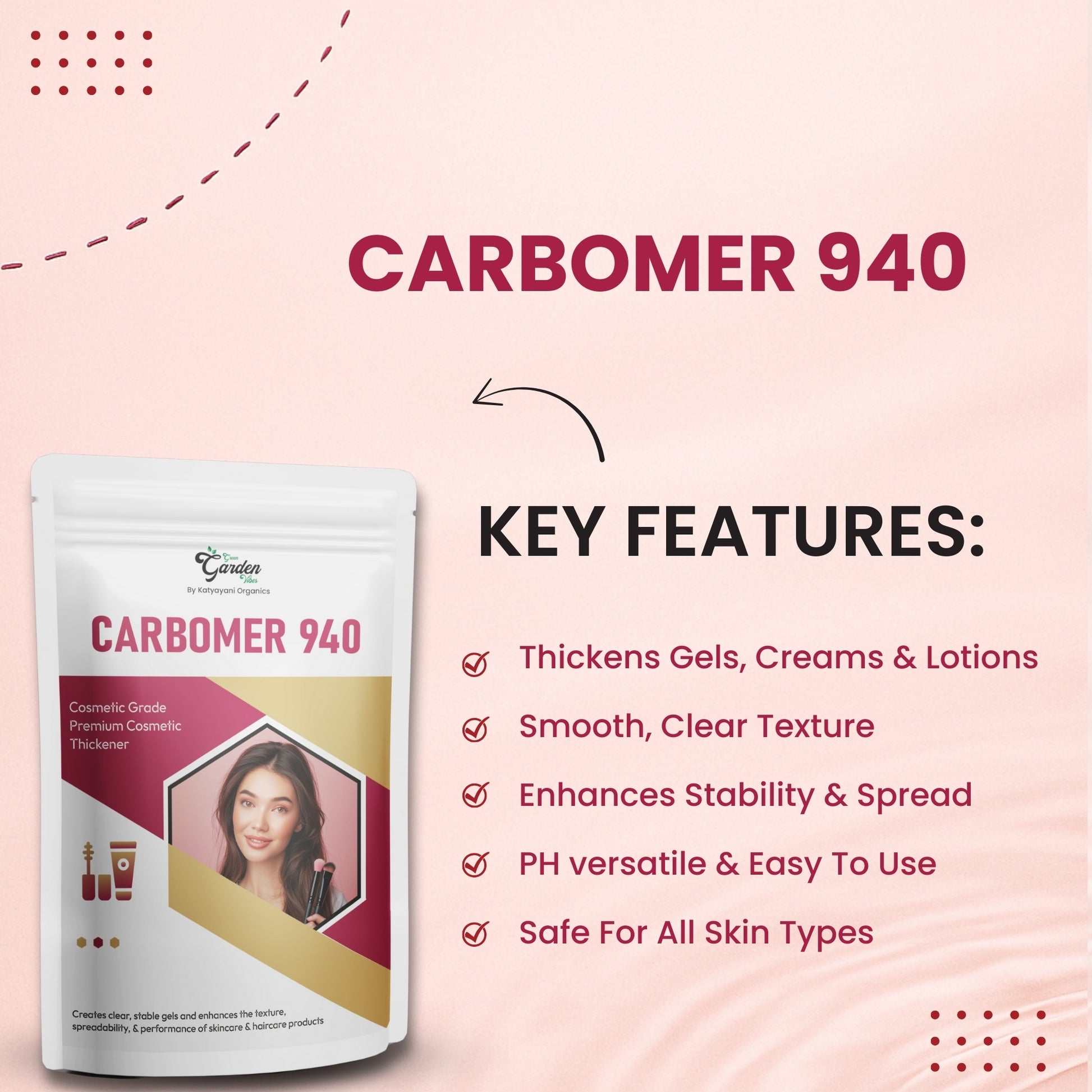 Carbomer 940 is a high-viscosity, white, granular powder commonly used in the cosmetic and personal care industry. It is a cross-linked polyacrylic acid polymer that serves as a thickening agent, stabilizer, and emulsifier in various formulations. Carbomer 940 is known for its ability to produce clear gels and enhance the texture and spreadability of cosmetic products.