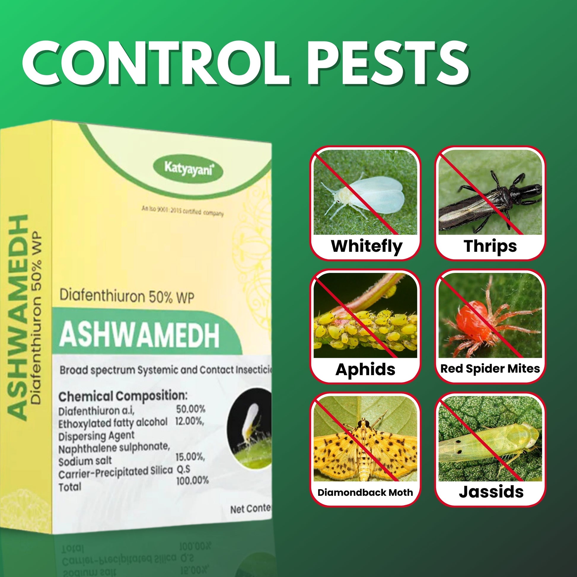 Ashwamedh Plus is a next-generation insecticide formulated with a powerful combination of Diafenthiuron and Acetamiprid, specifically designed to deliver rapid, long-lasting control of sucking pests such as whiteflies, aphids, and jassids. Its dual-action formula not only disrupts pest feeding and egg-laying behavior but also offers contact, systemic, and vapor-phase protection—even reaching pests hiding on the undersides of leaves.