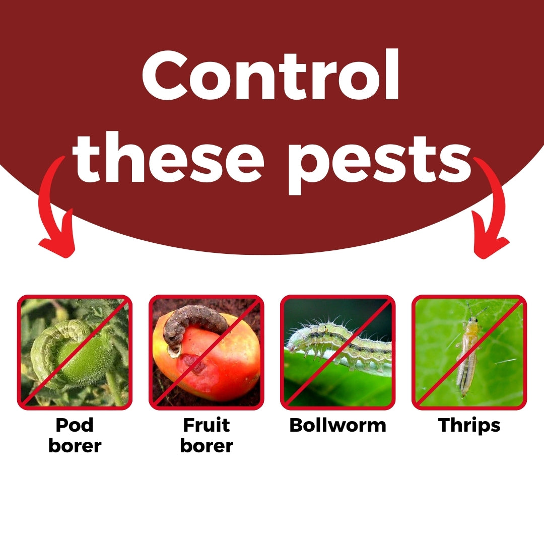 Controls a wide range of pests including bollworms, pod borers, fruit borers, shoot borers, thrips, mites, and loopers.