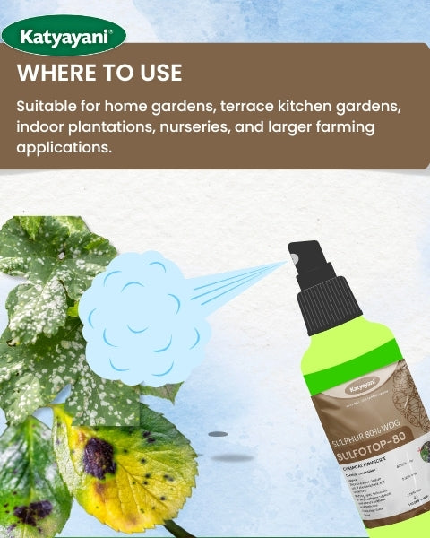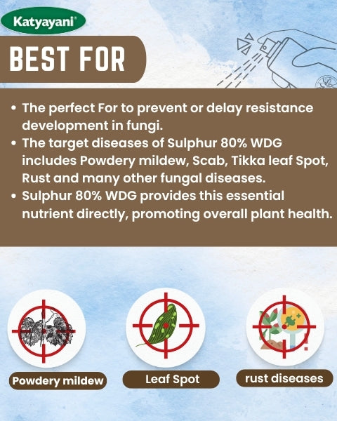 Katyayani Sulfotop 80 is a powerful contact fungicide and acaricide, formulated with Sulphur 80% WDG (Water Dispersible Granules). Designed for effective control of powdery mildew, scab, rust, tikka leaf spot, and more, it also delivers mite suppression β offering dual benefits of disease and pest management.