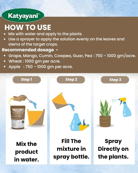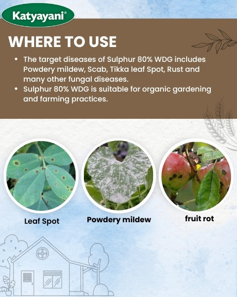 Effective against powdery mildew, scab, rust, tikka leaf spot, and other fungal pathogens across fruits, vegetables, pulses, and cereals.