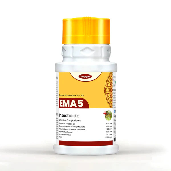 Katyayani EMA 5 is a broad-spectrum insecticide and acaricide powered by Emamectin Benzoate 5% SG, designed for effective control of chewing pests and mites. Its unique mode of action disrupts nerve transmission, causing paralysis and death of targeted pests in the larval stage, especially those from the Lepidoptera family.