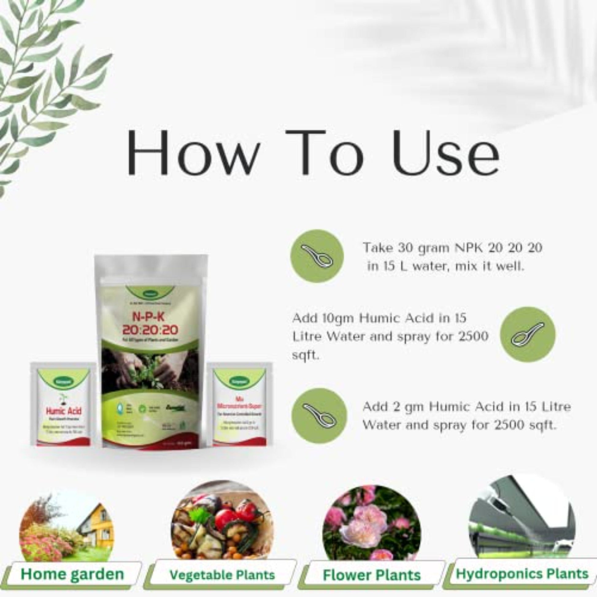 Cost-Effective Innovation: Our revolutionary 3-in-1 technology delivers outstanding value. In addition to NPK (20-20-20), you'll receive two supplementary packages – a concentrated mix of essential micronutrients and organic activated humic acid.