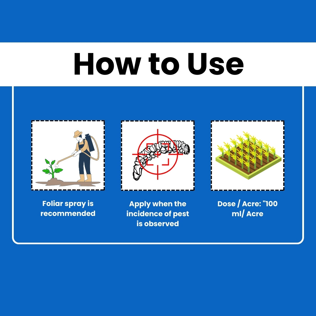 It has a two way system, it is phloem mobile, interferes with lipid synthesis, and kills by ingestion. It also has contact activity and Trans laminar movement (from upper to lower leaf surface) in the plant and thus controls even those insects which are hidden. Works preventively and curatively by killing all stages of LEAF MINER, It is used to kill hazardous larval insect-pest particularly Spodoptera, Heliothis, Spotted bollworm, pink ball worm, brinjal leaf miner larva, sugarcane bollworm etc . It can be used on greenhouse grown ornamentals including flowering & foliage crops, ground crops covers shrubs, Fruit & nut trees.