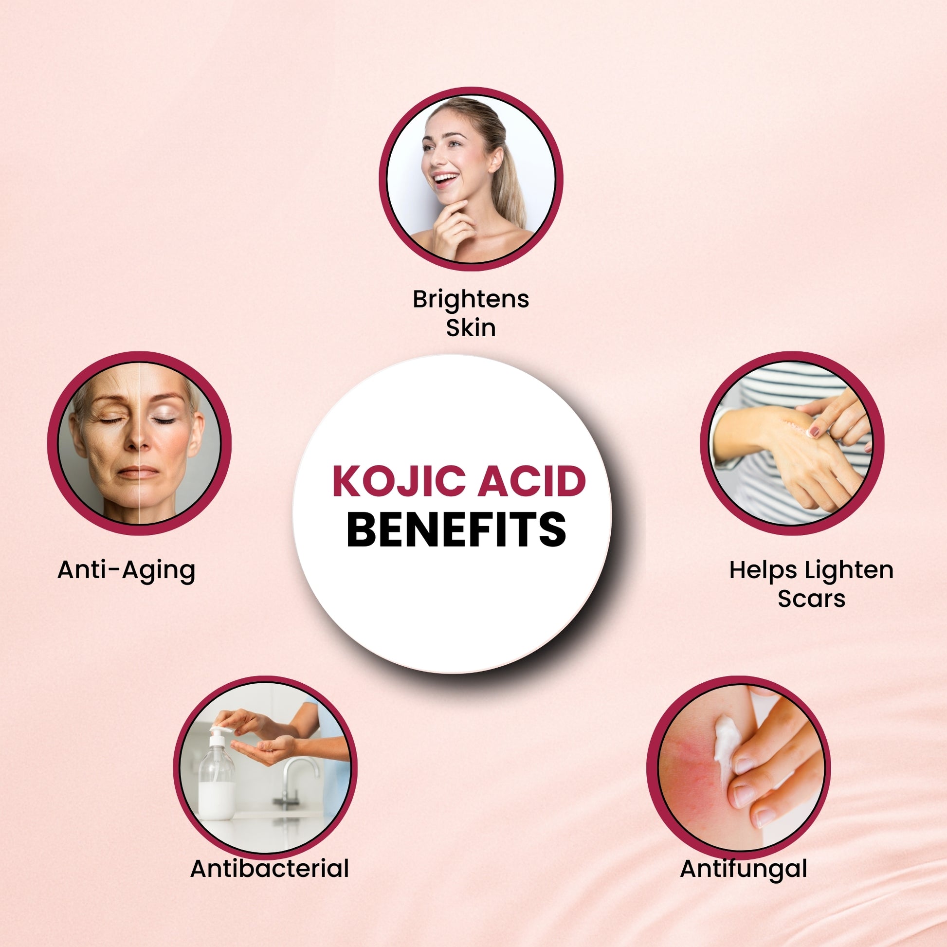 Kojic Acid blocks melanin production, reducing dark spots, age spots, and uneven pigmentation.