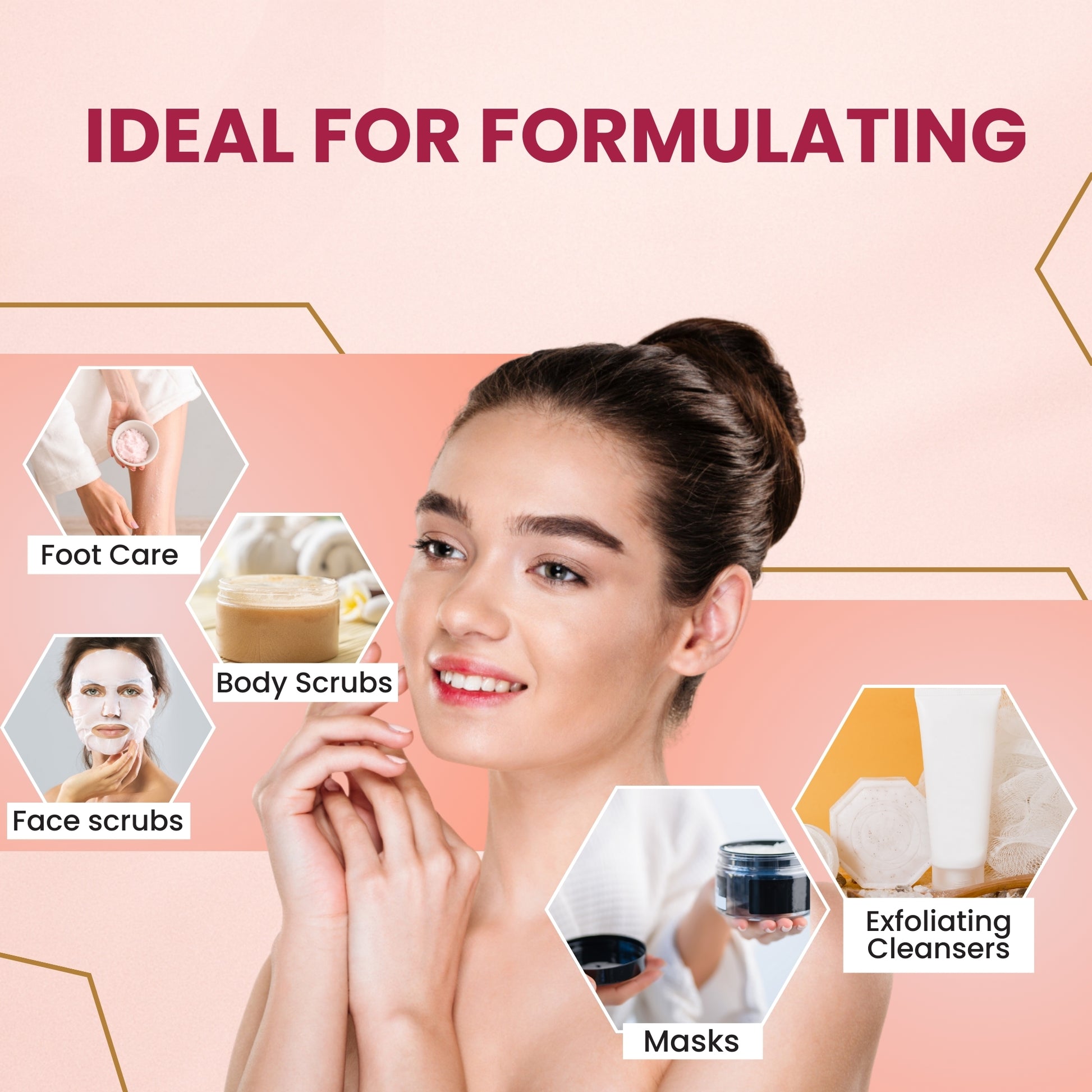 - Versatile Use: It can be incorporated into various cosmetic products such as exfoliating scrubs, foot care treatments, body masks, and face cleansers.