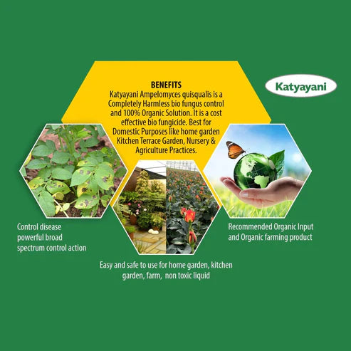 - Katyayani Ampelomyces quisqualis ایک مکمل طور پر ماحول دوست ہرملیس بائیو فنگسائڈ اور 100% نامیاتی حل ہے۔ یہ ایک سستی بایو فنگسائڈ ہے۔ گھریلو مقاصد کے لیے بہترین جیسے گھریلو باغ کچن ٹیرس گارڈن، نرسری اور زراعت کے طریقے۔